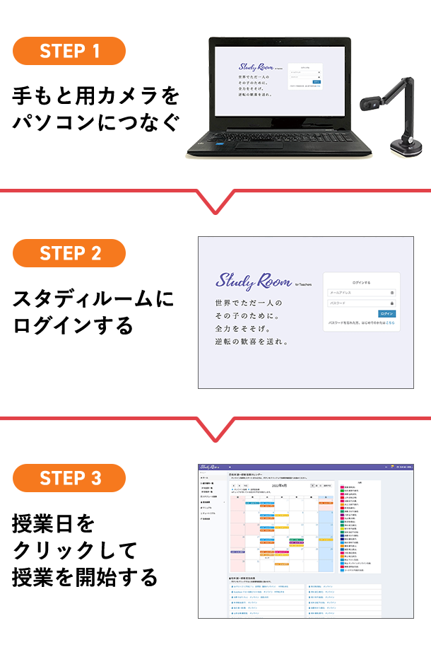 メガスタでオンライン指導を始める場合は、パソコンにカメラをつないでオンライン指導システムにログインするだけです。