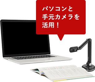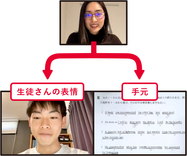 メガスタのオンライン指導では、生徒・教師お互いに手元用のカメラで参考書や書いているところを見せながら授業を行います。